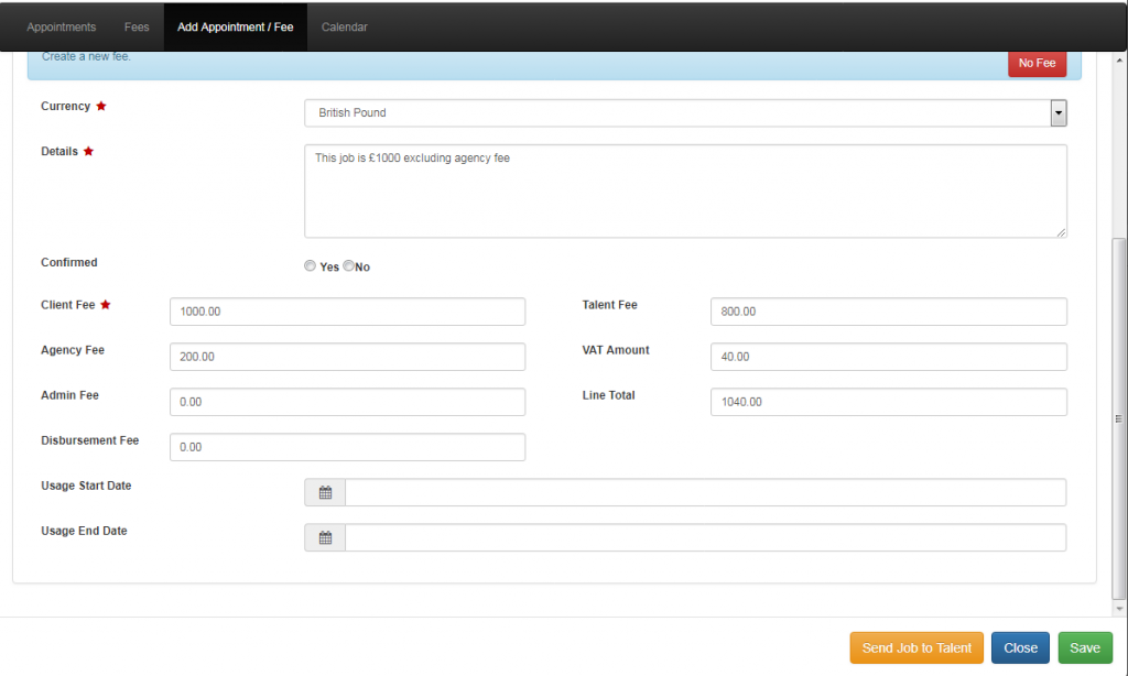 The talent should now be reading all the information about the job details (in which you have added in appointment and fees) – the more details you add the more the talent can understand the job