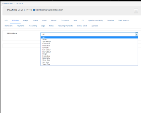 In attributes you can add in all the measurements of the model/talent. This can be altered by your agency’s needs e.g. if you need collar size.