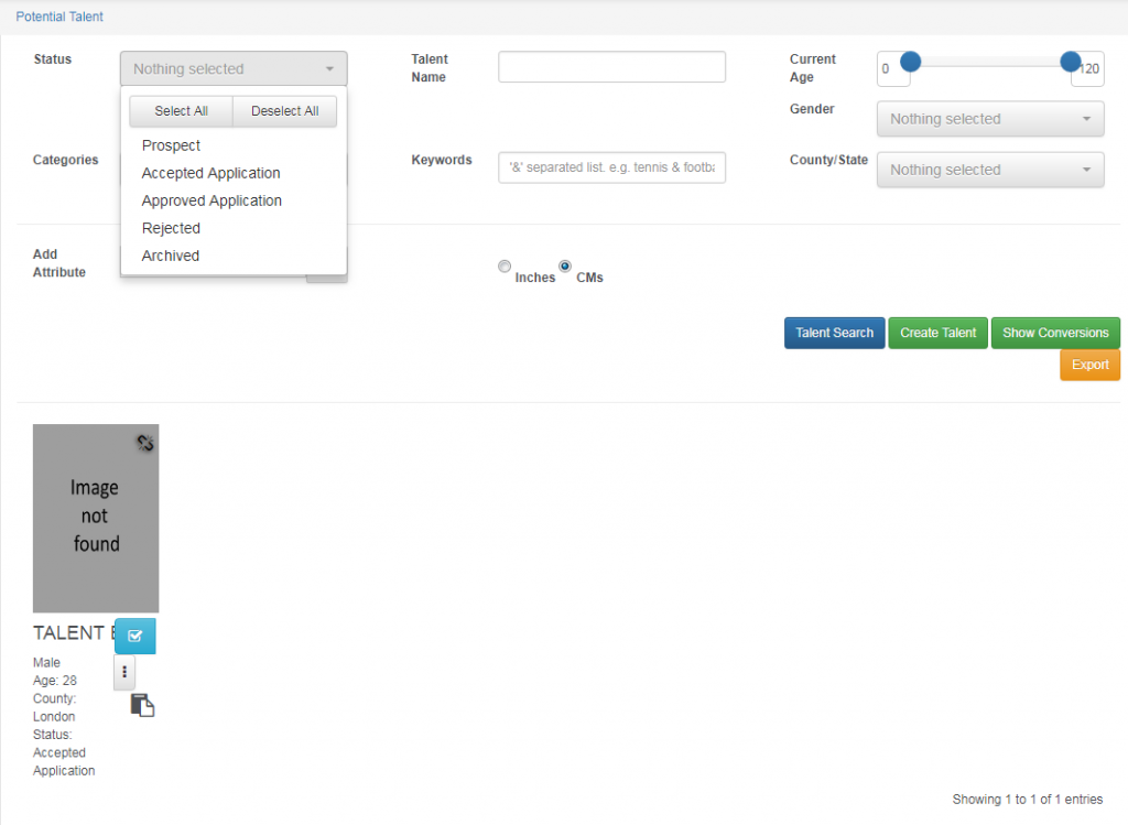 Potential talents lets you add or search potential models. The filtering system on MARS helps you to see prospect, accepted applications, approved applications, rejected and archived. You can search by name, keywords, attributes, current age, gender and location.